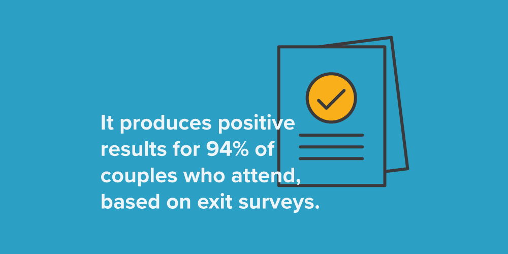 The results speak for themselves: 94% of couples who attend report positive outcomes based on exit surveys, with benefits shown to be similar to those achieved through six months of marital therapy. You'll leave with practical skills you can implement immediately, comprehensive take-home materials for continued growth, and a deeper understanding of what makes your relationship strong.